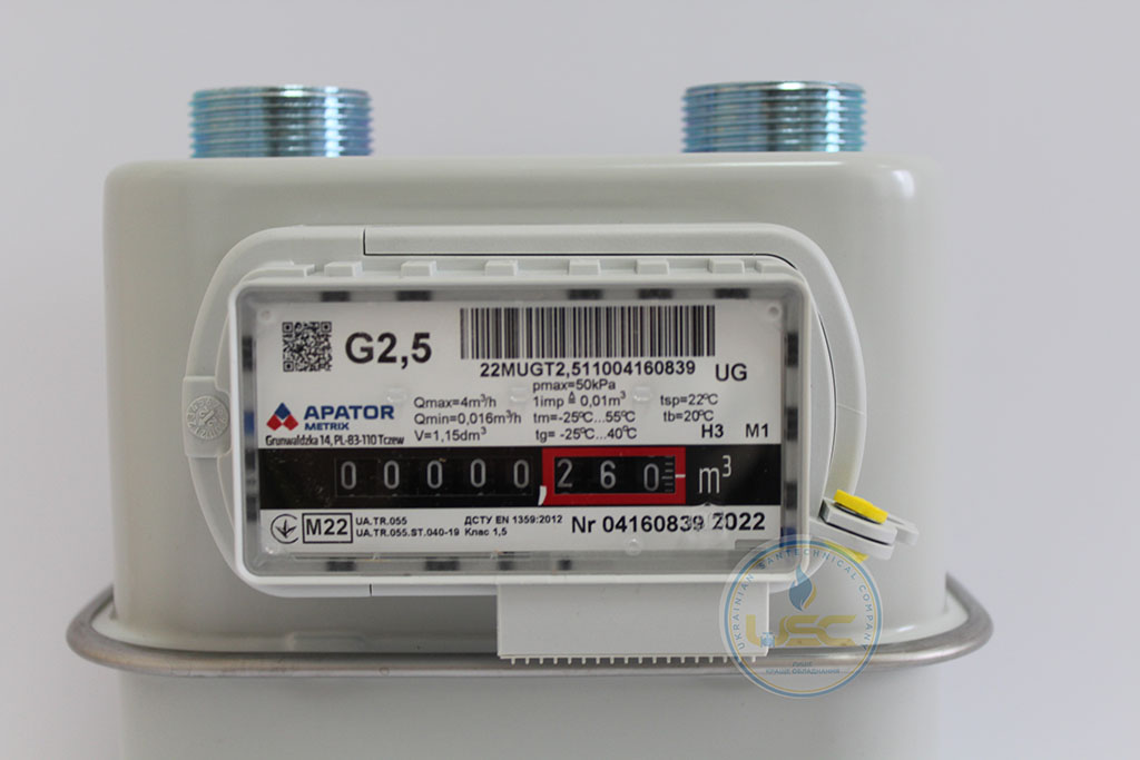 Мембранні лічильники обліку газу UG від європейського виробника Apator Metrix S.A. призначенні для контрольного вимірювання об'єму спожитого природного газу (або паливних газоподібних газів, пропану, бутану) у житловій і комунальній сфері. Можуть бути обладнані механізмом температурної компенсації. Виробник - Польща.