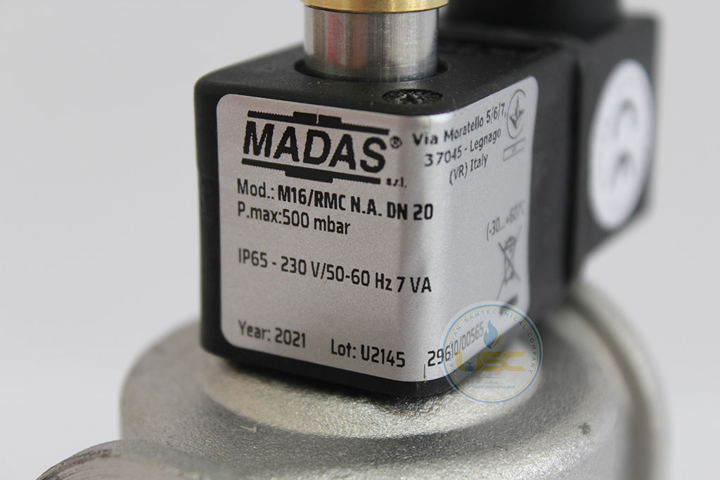 Електромагнітні клапана Madas - запобіжні прилади, що використовуються для відключення потоку газу при виникненні позаштатної ситуації. Якщо спрацьовує датчик безпеки (датчики загазованості, датчики-реле тиску, тощо) клапан закривається. Його відкриття здійснюється вручну. Нормально відкритий клапан (NA) закривається під напругою, нормально закритий клапан (NC) закривається при зникненні напруги. Країна виробник - Італія.
